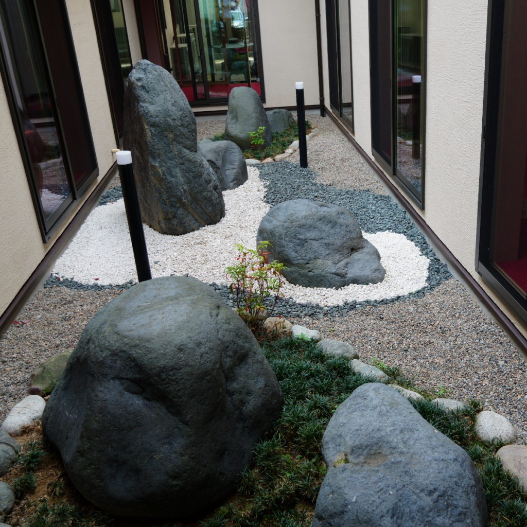 金沢会館は、聞法のための講堂が1棟、それ以外の機能(会合室、子ども部屋、トイレ、談話室など)を集約したもう1棟の“2棟建て”である。2つの建物は2本の渡り廊下で結ばれ、その間には石庭がある。堂々たる外観は、いかにも法城らしい。